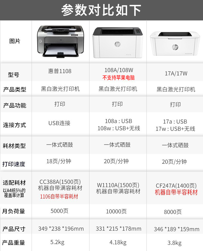 惠普(HP)1108/17w/108w/108a/104a A4黑白激光打印機家用小型辦公同1020 108w(1108升級版無線+滿容耗材)