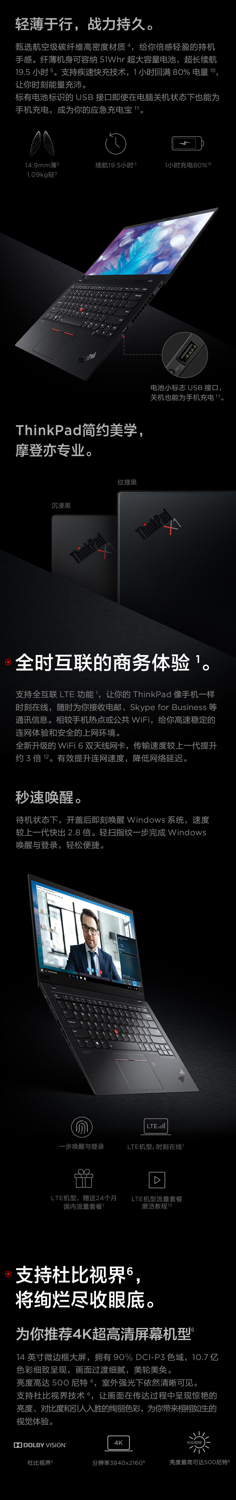 聯(lián)想ThinkPad X1 Carbon 2020 7HCD 英特爾酷睿i7 14英寸輕薄筆記本電腦 十代i7 16G 512G WQHD 4G版 沉浸黑