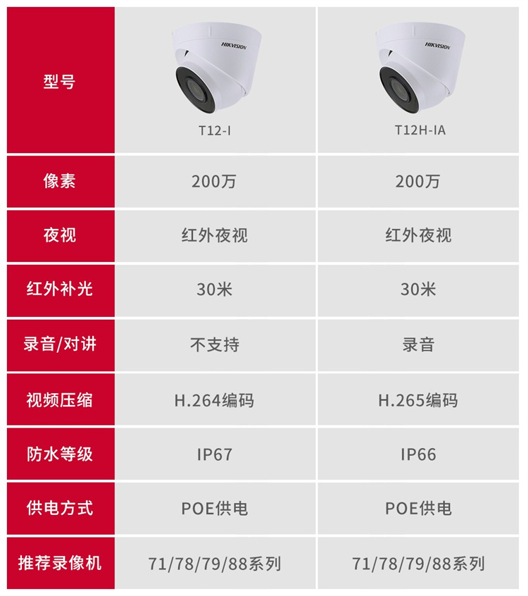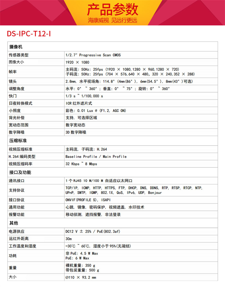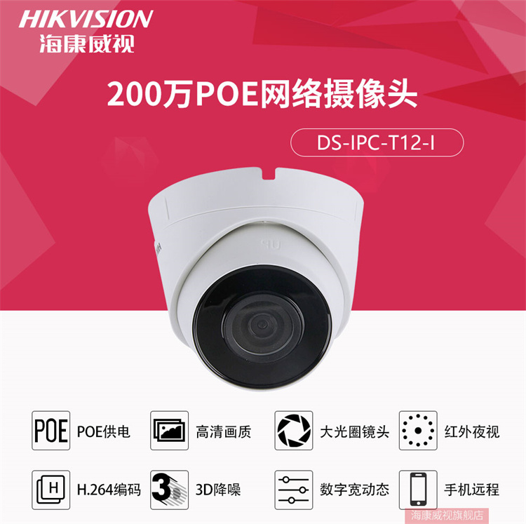 海康威視 T12-I 視頻監(jiān)控設(shè)備 ??低暰W(wǎng)絡(luò)監(jiān)控攝像頭200萬高清紅外夜視半球攝像機帶POE 官方標配 2.8MM焦距